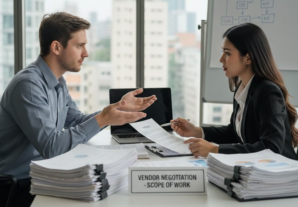 Kesalahan lain adalah menganggap bahwa semua hal yang tidak tertulis otomatis tidak menjadi tanggung jawab vendor. Dalam praktiknya, pengguna jasa kerap menganggap hal-hal “wajar” sebagai bagian dari pekerjaan, meskipun tidak tertulis secara rinci. Jika vendor tidak mengklarifikasi sejak awal, perbedaan persepsi ini akan muncul di tengah proyek dan berujung pada konflik. Di sinilah pentingnya negosiasi lingkup pekerjaan sebagai forum untuk menyamakan persepsi sebelum kontrak mengikat secara hukum.
